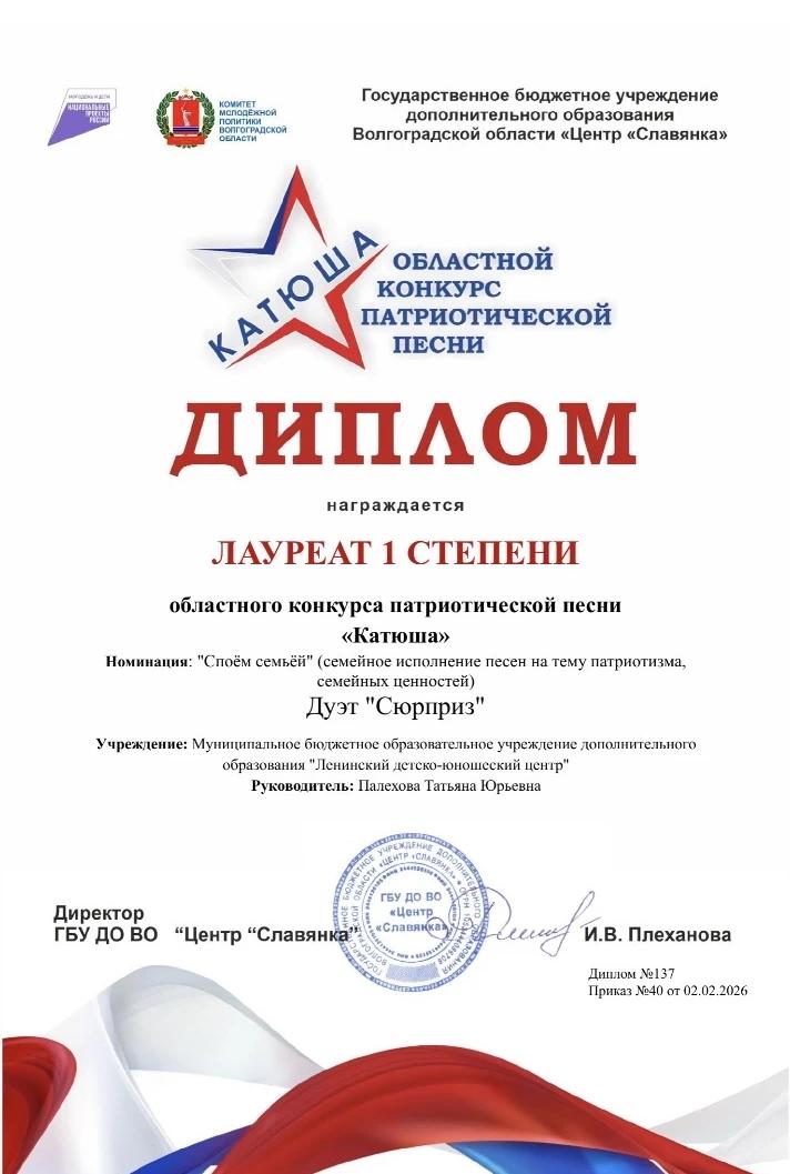 Также Лауреатом первой степени стал дуэт «Сюрприз» под руководством Палеховой Татьяны Юрьевны в номинации «Споём семьёй».